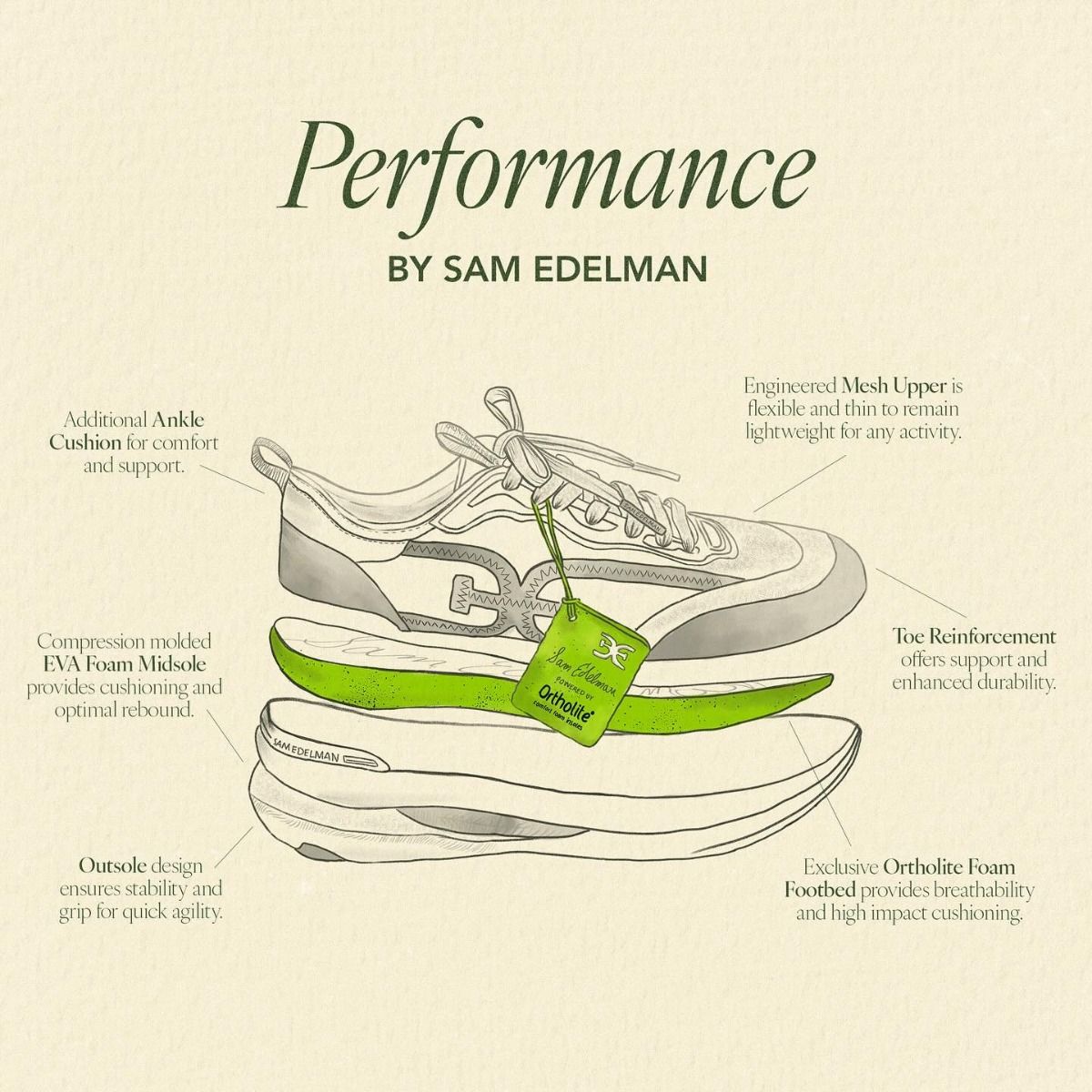 Introducing Sam Edelman's first-ever performance collection. Whether you're hitting a HIIT workout, going for a light run, or stepping into your daily exercise routine, these sneakers are engineered to keep you moving with ease.